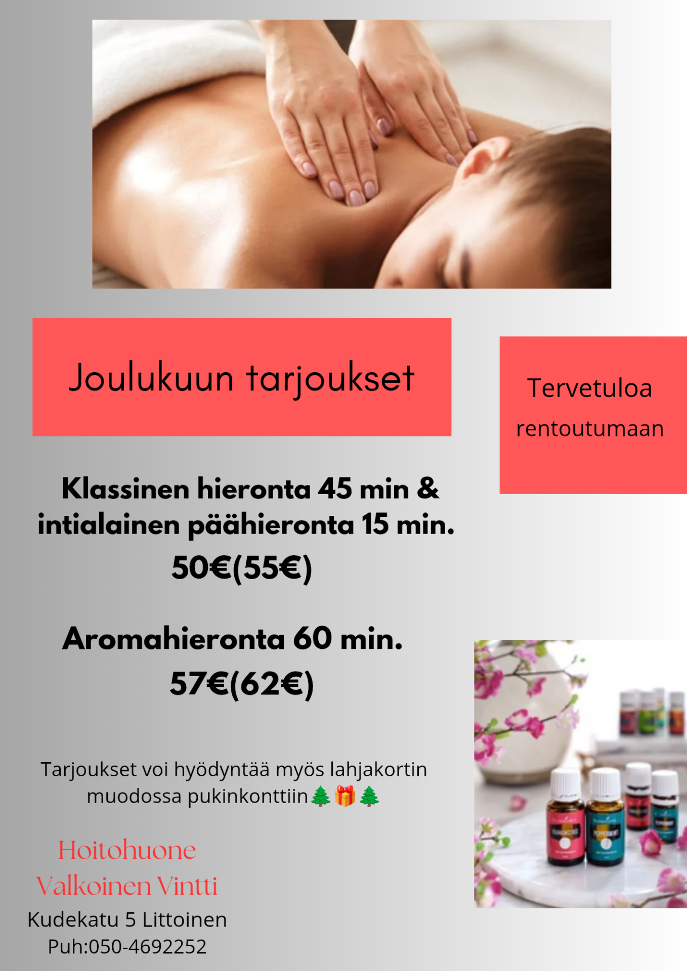 Joulukuun tarjoukset, ajan voit varata myös tammikuulle tarjoushintaan kun varaat ajan joulukuun aikana.