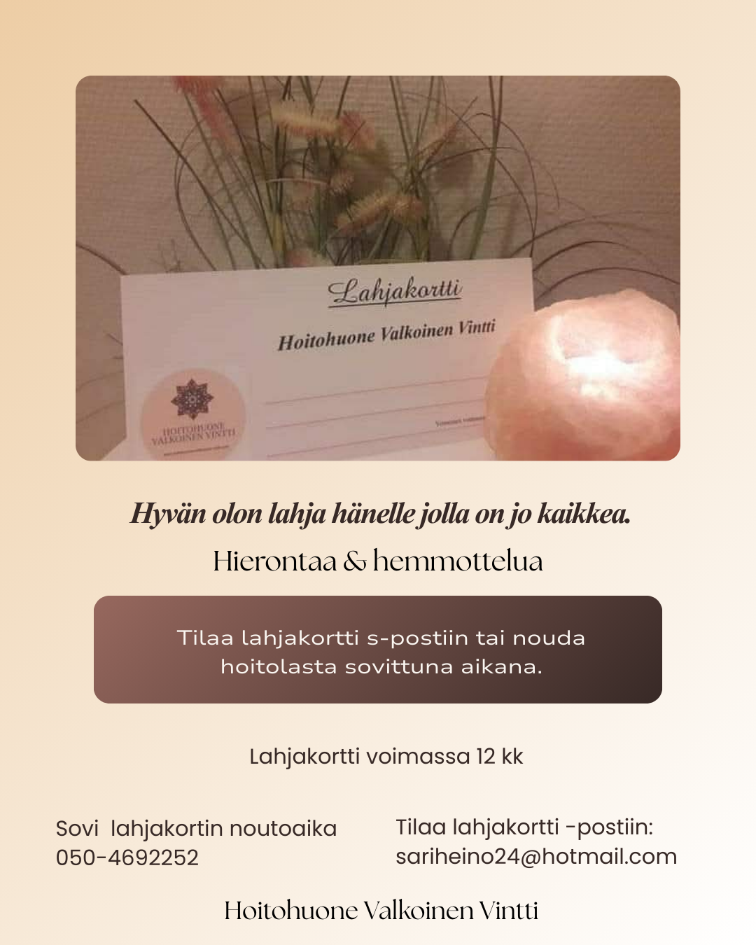 Myynnissä myös lahjakortteja hierontoihin ja hoitoihin. Lahjakortit voimassa 12 kk ostopäivästä eteenpäin. Lahjakortteja voi ostaa hoitolasta sovittuna aikana tai lahjakortin voi myös tilata s-postiin josta voit tulostaa sen. TILAA LAHJAKORTTI S-POSTIIN: Laita viestiä sariheino24@hotmail.com tai ota yhteyttä 050-4692252. Kerro mihin hierontaan tai mille summalle haluat lahjakortin. Laskutusta varten laita nimesi,osoitteesi,puhelinnumerosi sekä s-postiosoitteesi. Lahjakortin lähetän saman päivän aikana.