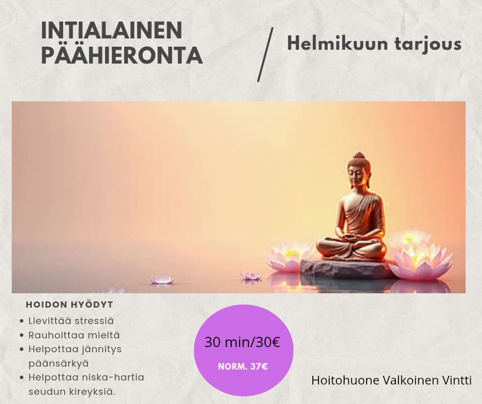 INTIALAINEN PÄÄHIERONTA: Intialainen päähieronta on osa ayurvedista perinnettä jota on harjoitettu intiassa jo yli 5000 vuotta. Intialainen päähieronta vaikuttaa monin tavoin kehoon sekä mieleen ja on erittäin rentouttava. Hoidon teho perustuu aineenvaihdunnan ja verenkierron lisääntymiseen ja mielihyvähormonin erittymiseen. Hoidossa käsitellään pään lisäksi yläselkä, hartiat, niska, kasvot ja korvat. Hoidon aikana istutaan tuolilla mutta asiakkaan toiveen mukaan hoito voidaan tehdä myös hoitopöydällä maaten.